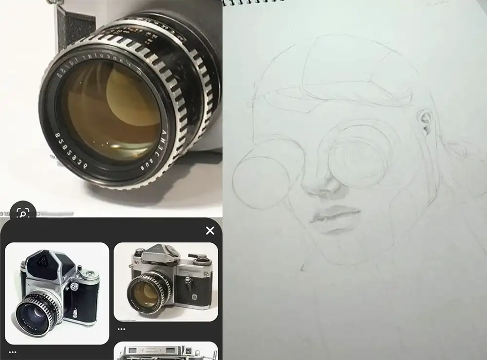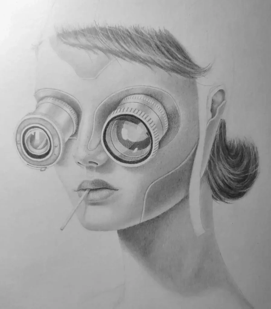 Comecei devagar. Primeiro, desenhei um olho humano normal – algo que já dominava, mas achei bem comum, nada de mais até que pensei, e se…uma pessoa conseguisse enxergar através de uma lente fotográfica? pode parecer maluco, más se a gente imagina laaaaa na frente no ano 2300 ou talvez antes, implantes mecânicos irão existir não é mesmo?, e com muito cuidado, comecei a transformar o espaço do olho em alguma lente aleatoria que achei de referência na internet. Cada traço do lápis grafito parecia uma decisão irreversível.