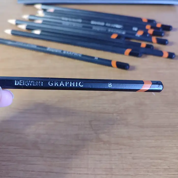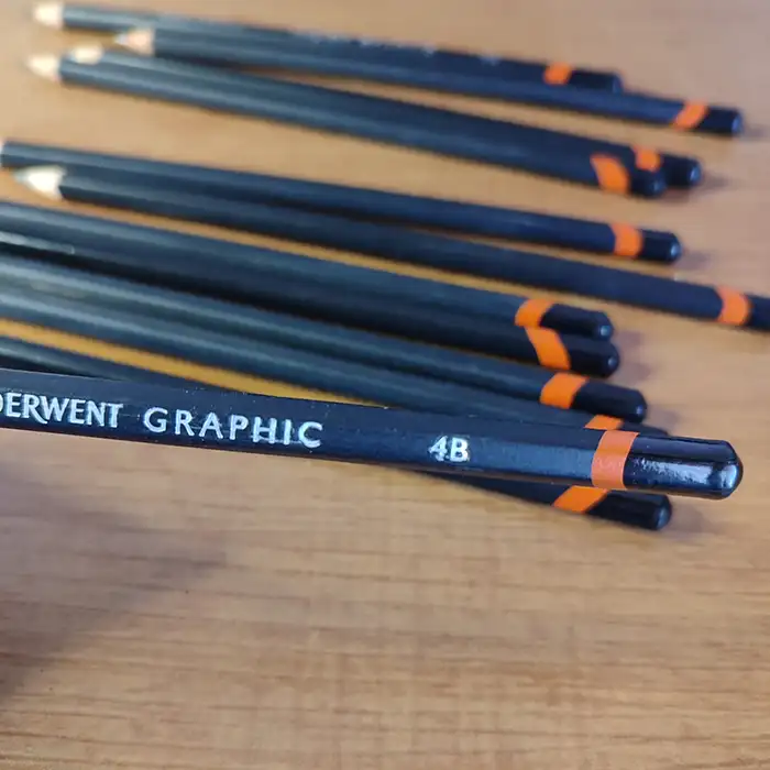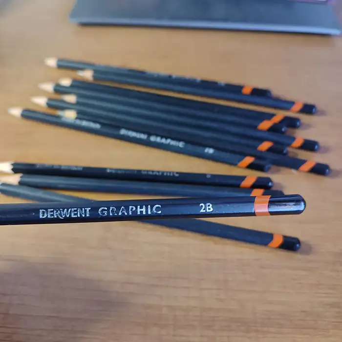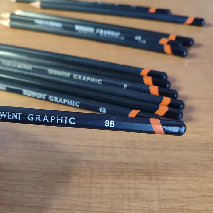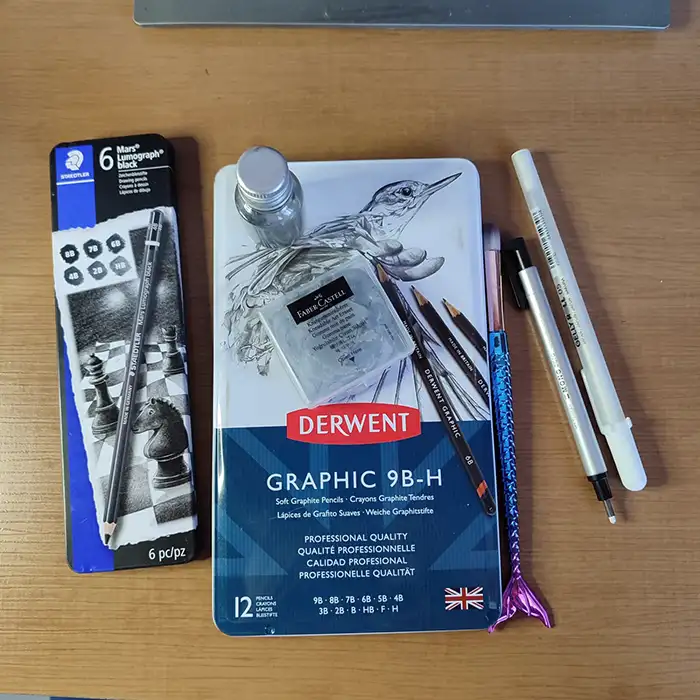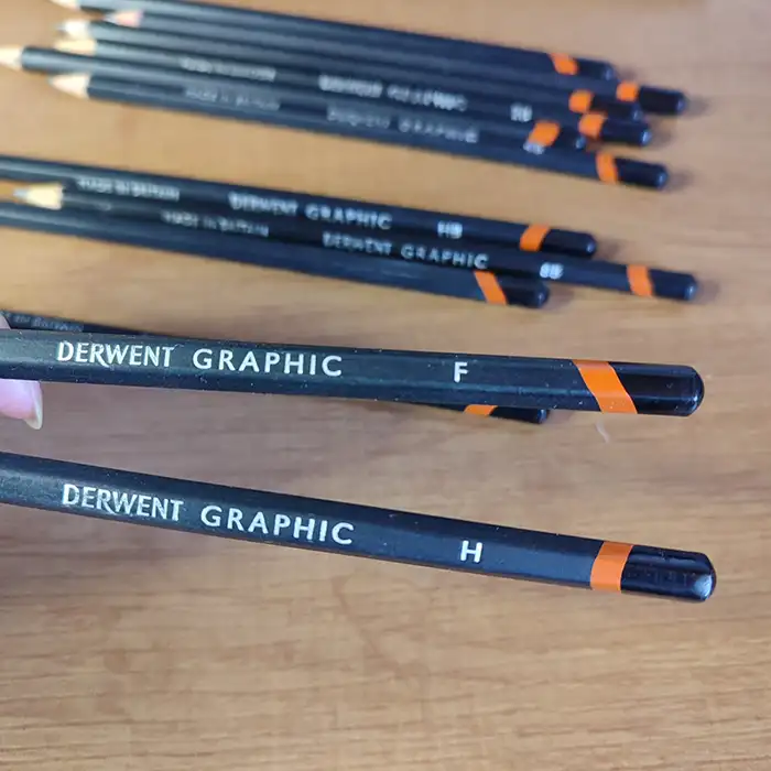 Meu Derwent H ou F: É meu companheiro para esboços iniciais. É tímido, quase invisível, perfeito para quando ainda estou descobrindo as formas. Aprendi da pior maneira que forçar esse lápis resulta em sulcos no papel – erro que me custou algumas obras no início, a folha fica marcada se os trazos são realizados com muita força.