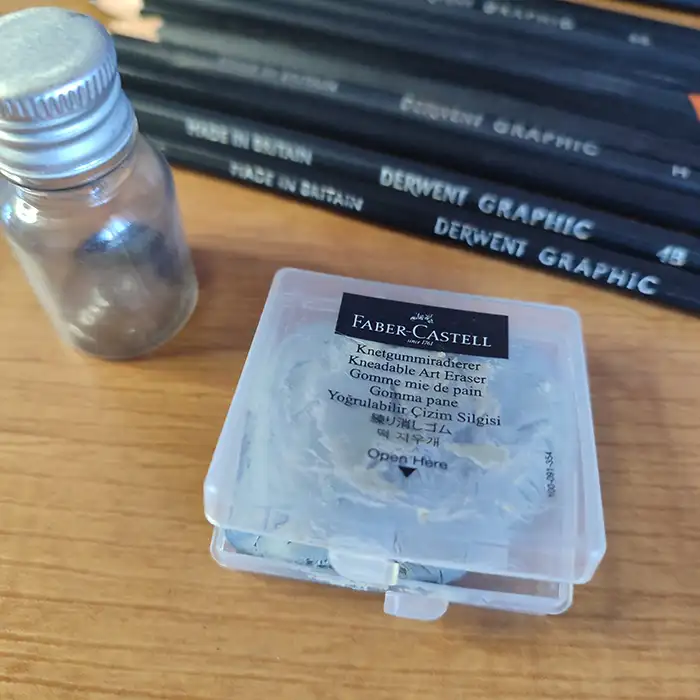 Minha goma maleável da Faber Castell: É como uma varinha mágica – não apenas apaga, mas cria luzes, texturas, efeitos. Alguns dias ela está perfeita, outros parece que perdeu a alma. Quando quero suavizar alguma sombra só deslizo a borracha suavemente como se estivesse amassando pão. Descobri que o clima influencia muito sua performance. Ela não é um lápis como o título o indica kk más age como se fosse por isso eu coloquei na lista 😀