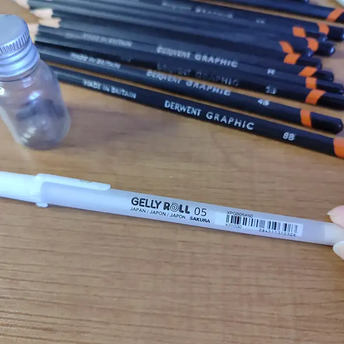 E por último mas não menos importante, a Gelly Roll da marca Sakura: É uma caneta em gel branca para criar detalhes sutis, muito boa quando quero criar pequenos brilhos nos olhos, nos dentes, pele etc. é perfeita.