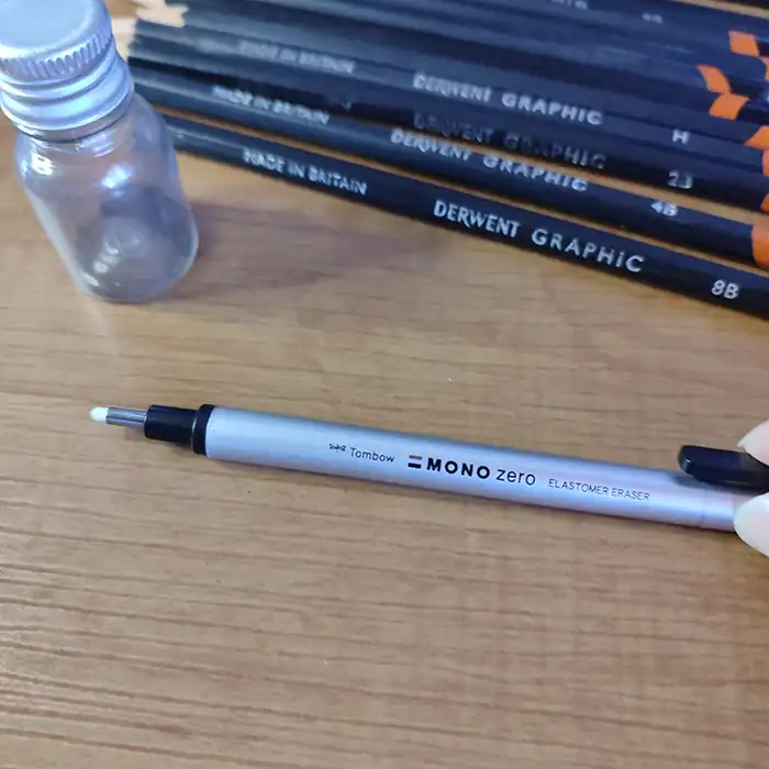 Lápis borracha Mono zero da Tombow: Uso muuuitooo, com a sua pontinha fina consigo chegar em qualquer canto, além de utilizar como lápis também é sensacional para fazer marcas “brancas” ou brilhos, da para fazer cabelos, gotas de agua, detalhes em pele, em fim, tem uma versatilidade incrível!